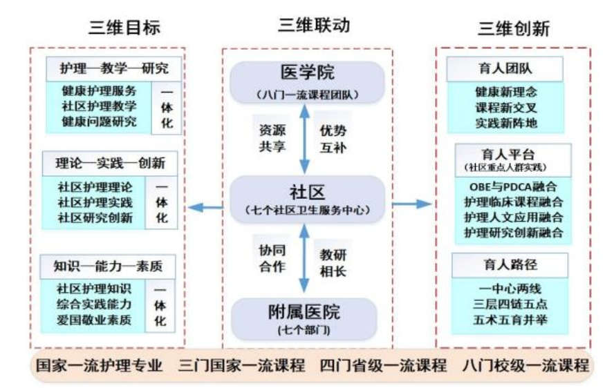 宋梅教授主持的《“健康引领、面向社区、三维联动”国家一流护理专业课程育人模式改革与实践》成果以习近平总书记关于教育的重要论述和健康中国战略为课程建设指导思想,以“立德树人、思政铸魂、立足社区、促进健康、注重创新、强化实践”为教学改革思路,结合学校办学定位,围绕社区护士“促进健康、预防疾病、恢复健康、减轻痛苦”的角色能力要求,联合附属医院和社区护理实践教学基地,经过14年探索,逐步形成了“健康引领、面向社区、三维联动”的一流课程育人模式。创建社区基地开放实践平台,依托“探究合作、协同指导、持续改进”的运作机制,打造“理实一体、知行合一”的第二课堂思政育人路径,强化学生对社区大健康理念的理解与应用能力,实现理论-实践-创新的无缝衔接,重塑学生的职业价值观,培养德智体美劳全面发展的“五术”护理人才。